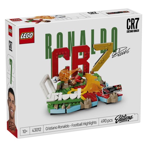 S kompletom za sestavljanje LEGO® Editions Cristiano Ronaldo – vrhunci nogometa se pokloni ikoničnemu nogometnemu zvezdniku. Podstavek je v obliki njegove začetnice in v barvah portugalske reprezentance ter vključuje velik CR7, njegovo ikonično kratico. Z minifiguro Cristiana Ronalda komplet resnično oživi, priložena pa je tudi zbirateljska ploščica z njegovimi statističnimi podatki in podpisom, na kateri so tudi številne zanimive podrobnosti, ki se navezujejo na njegovo življenje in kariero.