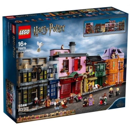 Ta velik razstavni model LEGO® Harry Potter™ Diagon Alley™ (75978) daje ljubiteljem filmov o Harryju Potterju, starim od 16 let, priložnost, da poustvarijo najbolj čarobno nakupovalno ulico v Londonu. Vključuje Ollivanders™ Wand Shop, Scribbulus™ pisalne pripomočke, Quality Quidditch™ Supplies, sladolednico Florean Fortescue, prodajalca knjig Flourish & Blotts™, Weasleys' Wizard Wheezes™ in vhod v Daily Prophet™. Komplet, ki meri več kot 29 cm v višino, 102 cm v širino in 13 cm v globino, je do strehe natrpan z avtentičnimi detajli.
