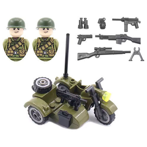 Set kock je idealen za ljubitelje WW2 tematike, saj predstavlja ameriški motor s prikolico. Vsebuje 2 figurici z orožjem. Brez škatle.